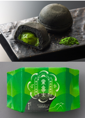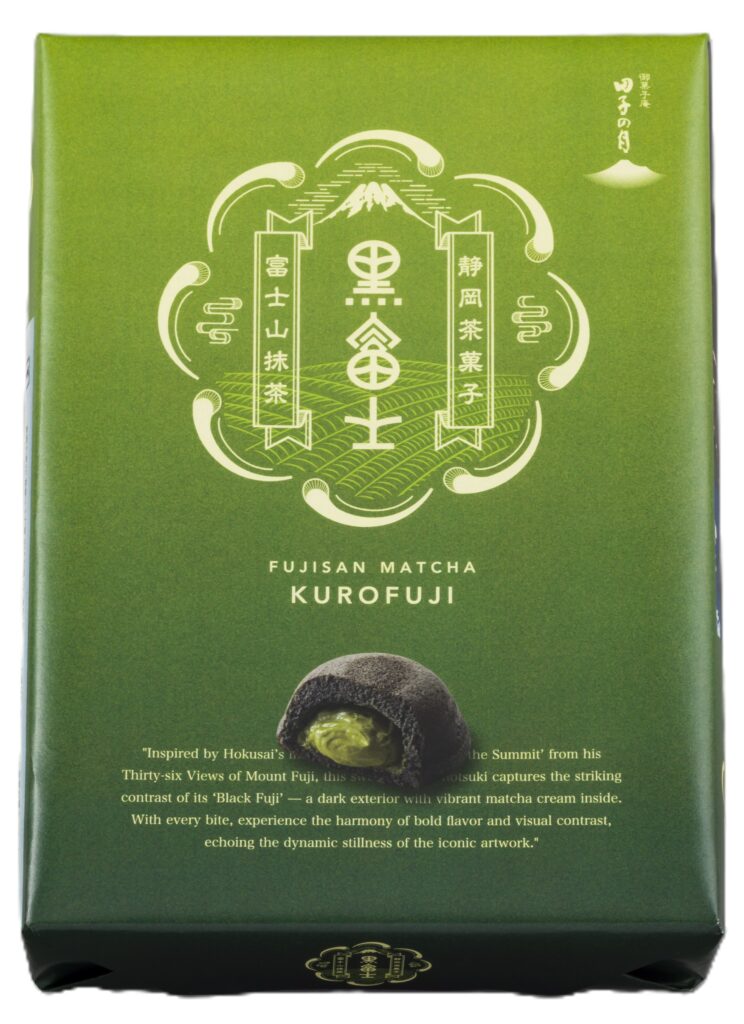 2025年12月13日(土)から発売スタートの田子の月の新商品『黒富士』は、浮世絵師・葛飾北斎の作品『富嶽三十六景 山下白雨』、通称“黒富士”からインスパイアされ誕生しました。中には、富士市で育てられたオーガニック抹茶を贅沢に使用した、濃厚な抹茶クリームがたっぷりと詰まっており、皮には、富士宮市で採れたお茶を炭にした“お茶炭”を使用し、黒と緑の美しいコントラストを表現。漆黒でエッジの効いた見た目とは裏腹に、口に運ぶと繊細な抹茶の風味がふわりと広がる一品に仕上がっています。