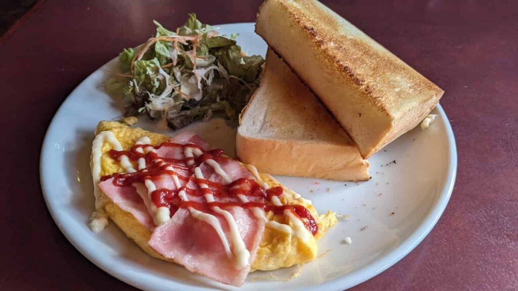 モーニングのBセット(690円※税込)は、オムレツ・ベーコン・角パントースト・サラダ・ドリンクがセットになっています。朝食には丁度良いボリューム感で、とても食べやすいセットになっています。