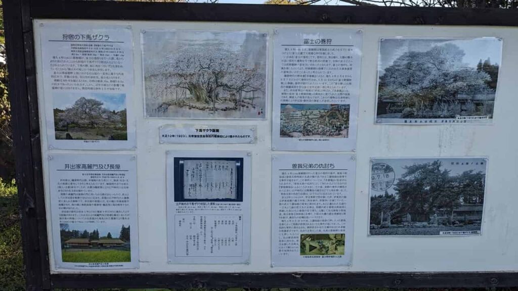 特別天然記念物に指定されている狩宿の下馬ザクラ(かりやどのげばざくら)は、静岡県道75号(清水富士宮線)の芝川と潤井川に挟まれた場所にあります。かつて源頼朝がこの桜の前で下馬したとされている有名な一本桜(ヤマザクラ)で、満開時には多くの方が訪れ、狩宿地区が大いに盛り上がります。